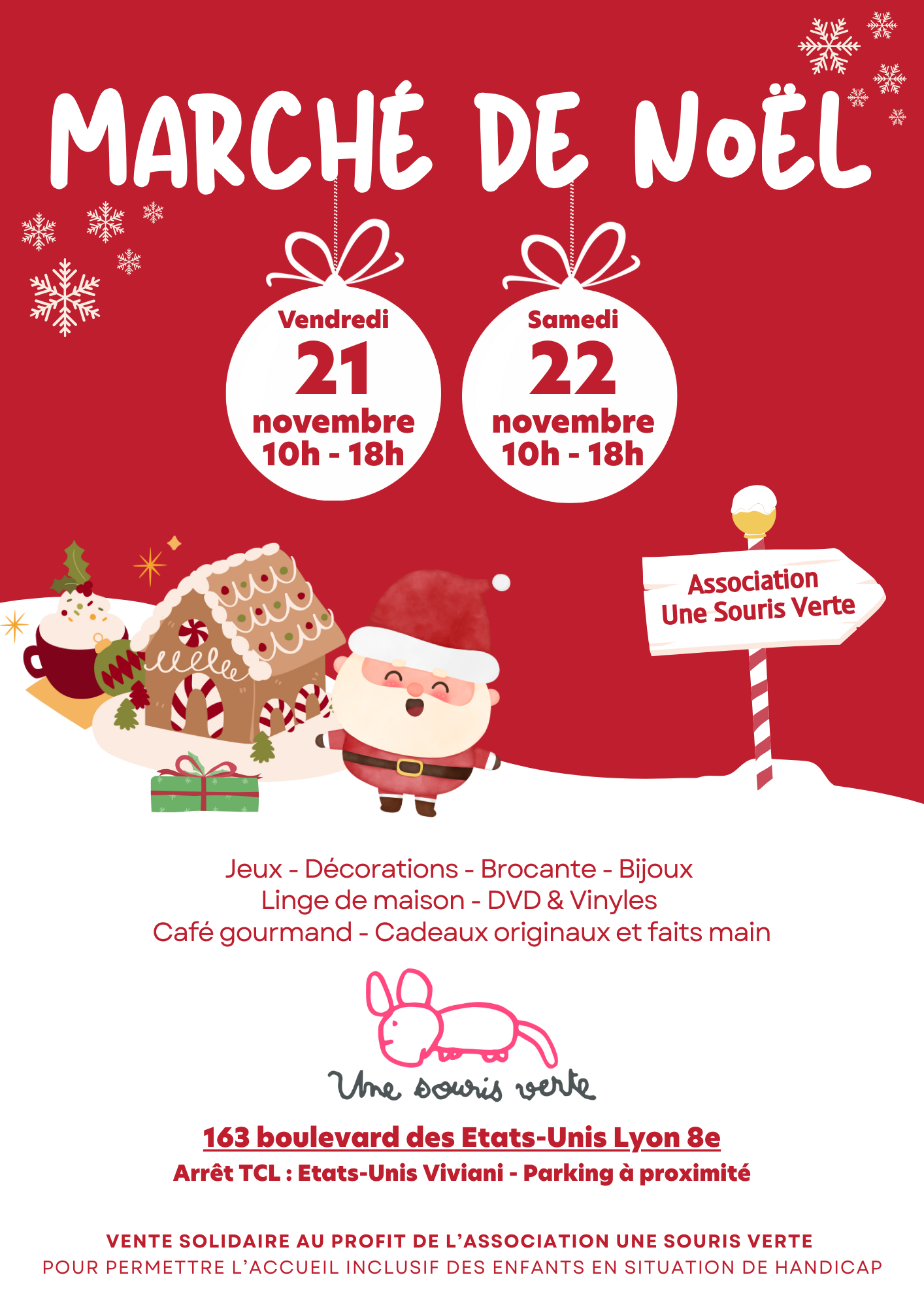 L’association Une Souris Verte est heureuse de vous annoncer qu’elle organisera le vendredi 21 et le samedi 22 novembre son traditionnel Marché de Noël. Cette vente solidaire au profit de l’association se tiendra au 163 boulevard des Etats-Unis, dans le 8ème arrondissement de Lyon, dans le bâtiment du siège de l’association.