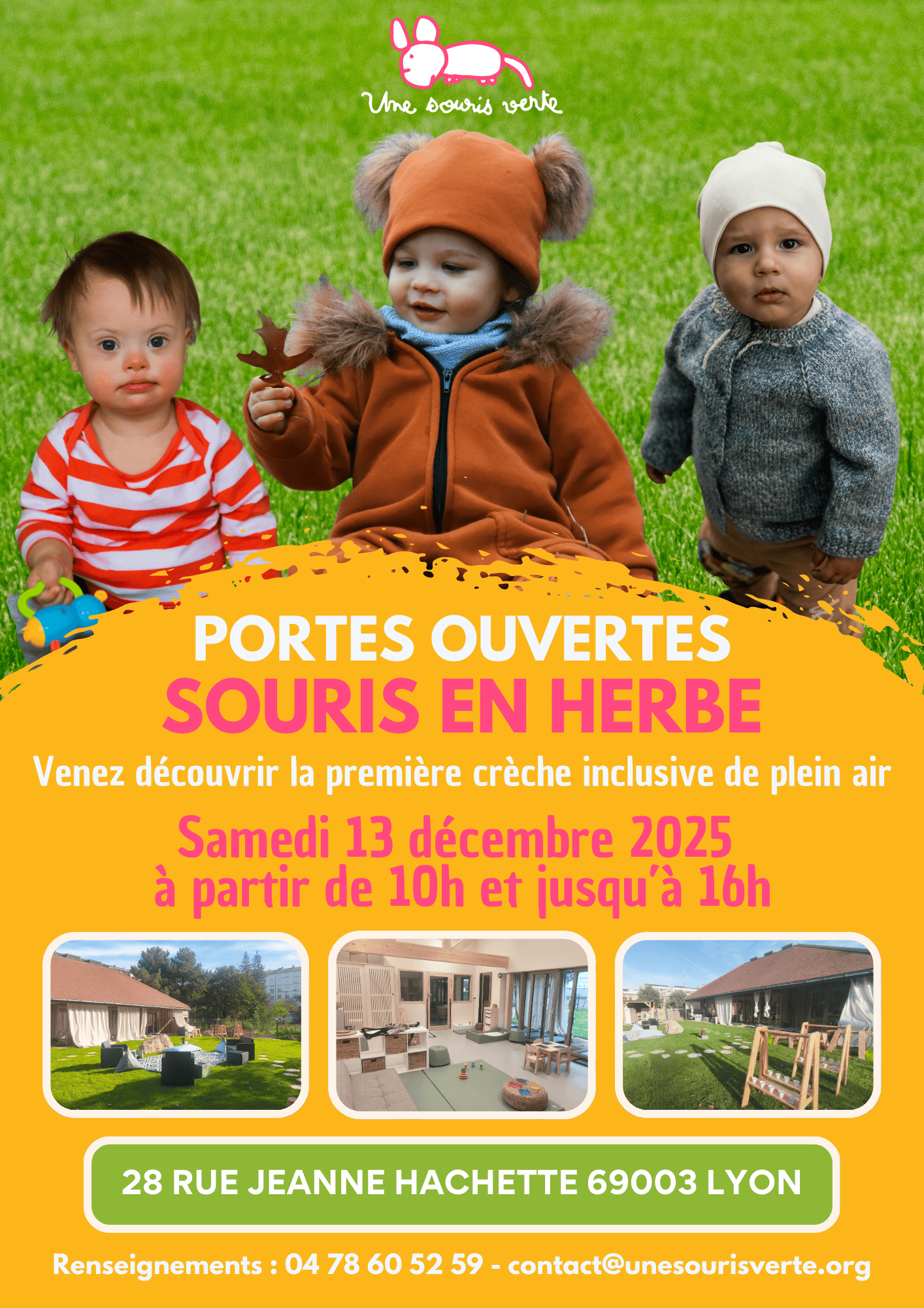 Nous avons le plaisir de vous inviter à la journée portes ouvertes pour découvrir Souris en Herbe, la nouvelle crèche inclusive de plein air de notre association !