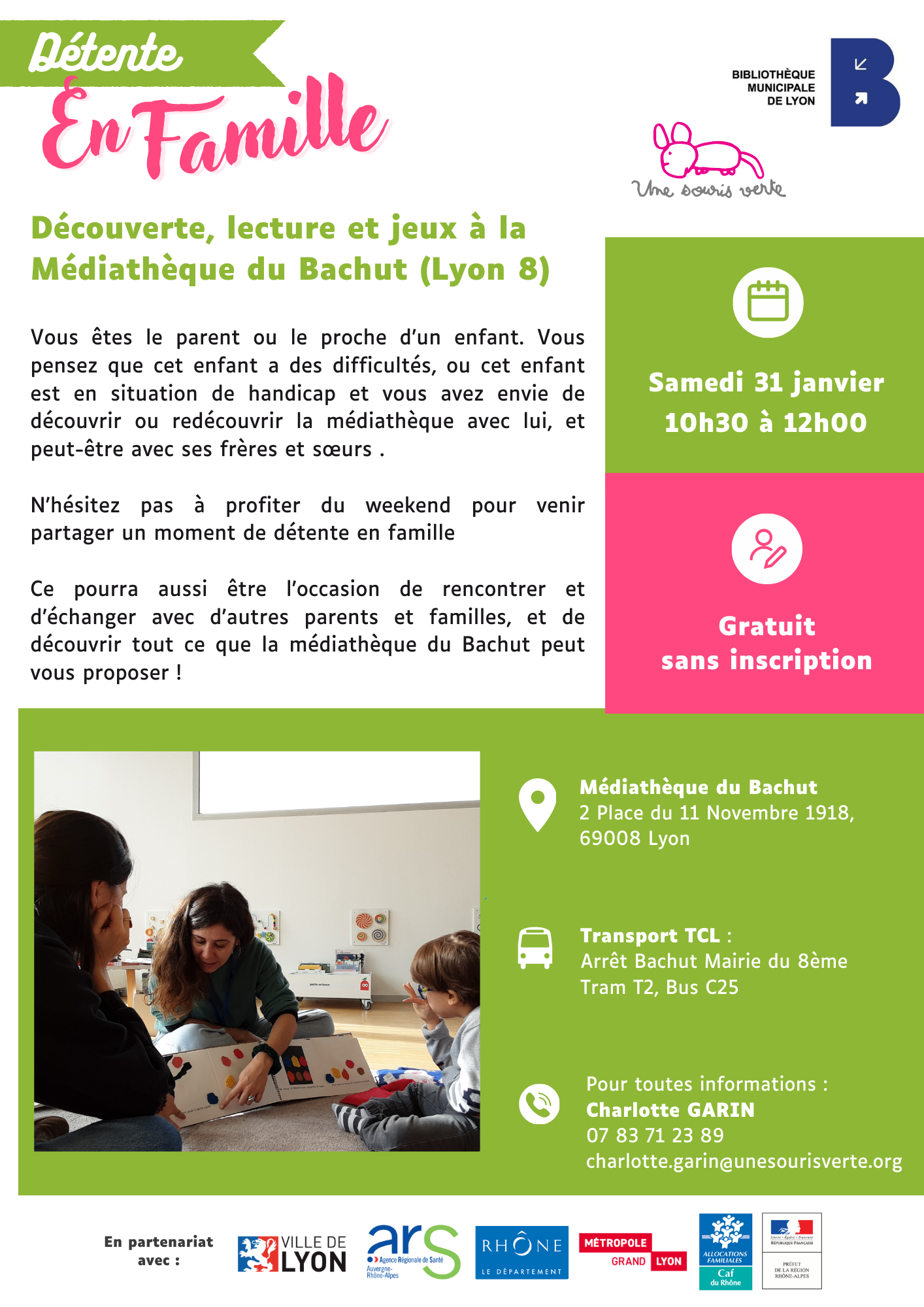 Pour 1/4h, une heure, toute la matinée, venez nous retrouver ! Ce sera l’occasion de découvrir la maison des aidants de Mions, lieu ressource fraîchement ouvert, et l’association Une Souris Verte qui agit pour permettre la pleine participation à la vie en société des enfants en situation handicap.