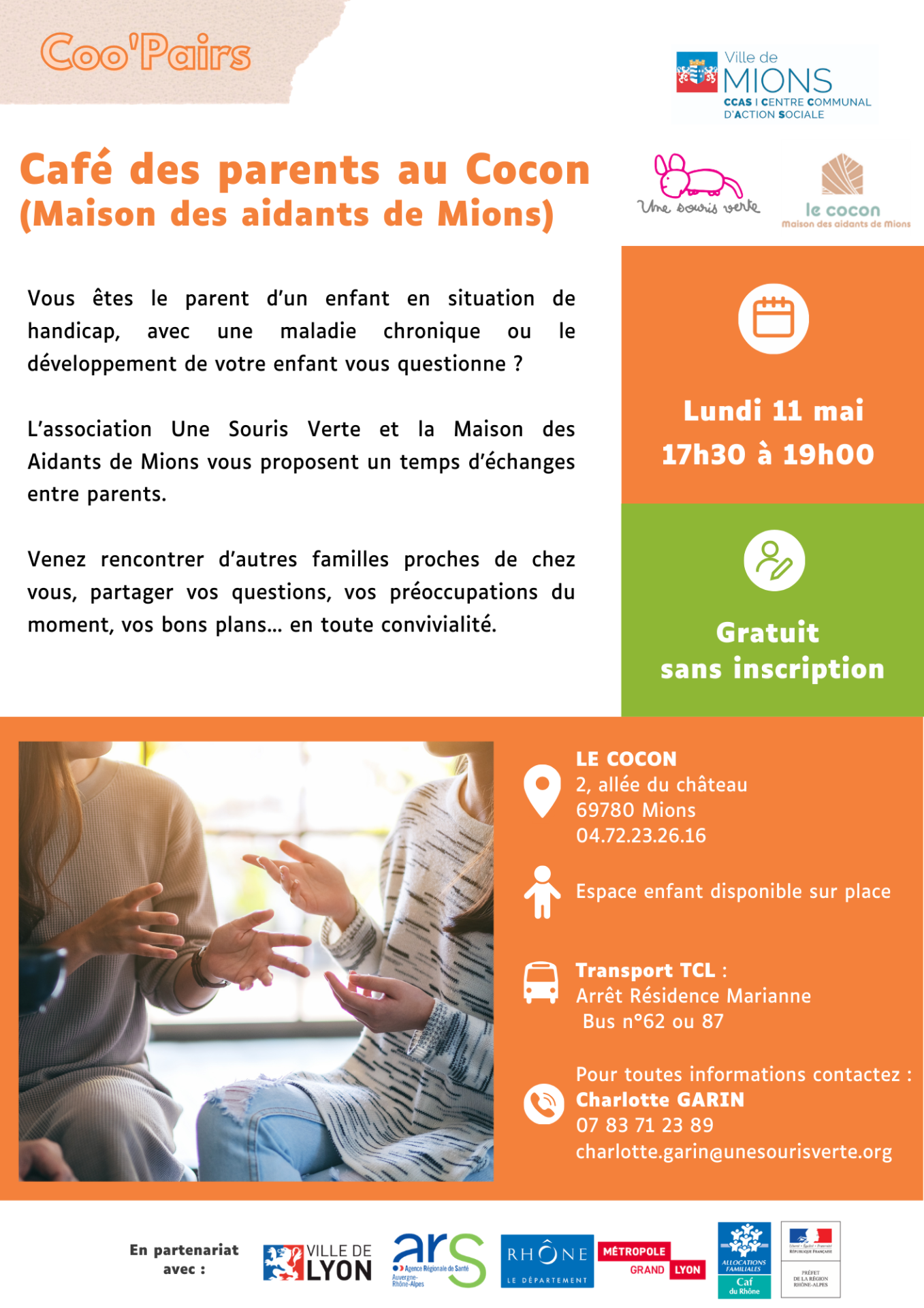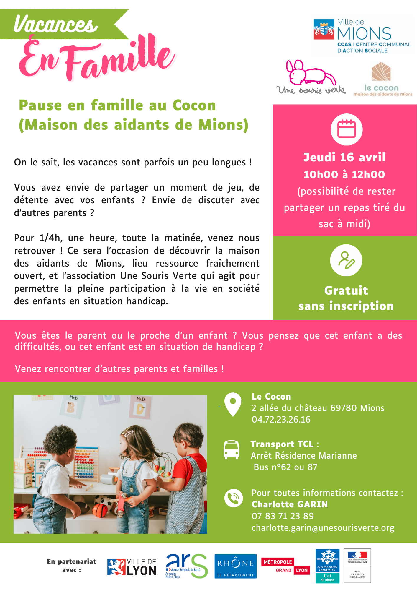Pour 1/4h, une heure, toute la matinée, venez nous retrouver ! Ce sera l’occasion de découvrir la maison des aidants de Mions, lieu ressource fraîchement ouvert, et l’association Une Souris Verte qui agit pour permettre la pleine participation à la vie en société des enfants en situation handicap.