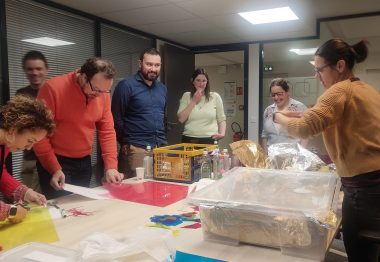 Après un temps de présentation de l’association, où les collaborateurs du groupe ont pu découvrir l’exposition « Et si on changeait de regard ! » et échanger avec les équipes d’Une Souris Verte, plusieurs ateliers créatifs ont pu être proposé. L’objectif était de réaliser différents outils sensoriels, habituellement conçus et réalisés par les équipes du Pôle de Ressources et d’Appui Handicap.